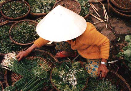 A vendor sorts her greens at the local market in Hoi An. Refrigeration is uncommon and markets are open nearly everyday providing the staples for fresh meals.
