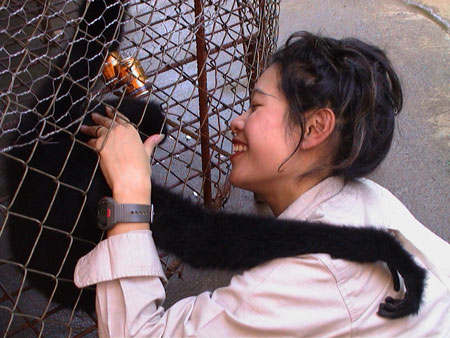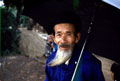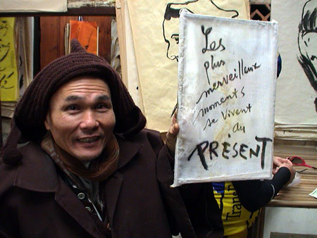 | A multilingual monk/artist, Vien Thuc, displays a poem in French in his Dalat studio/pagoda. | Tree makes friends with a gibbon in Bao Loc, near Dalat. | Low in the water, a fisherman passes by in Halong Bay. |