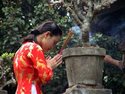 (click on any image to enlarge)| Young girls dressed for Tet on Dai Lunh beach. | Mother and daughter in the Central Highland near Pleiku | Prayer ritual at the One Pillar Pagoda in Hanoi |